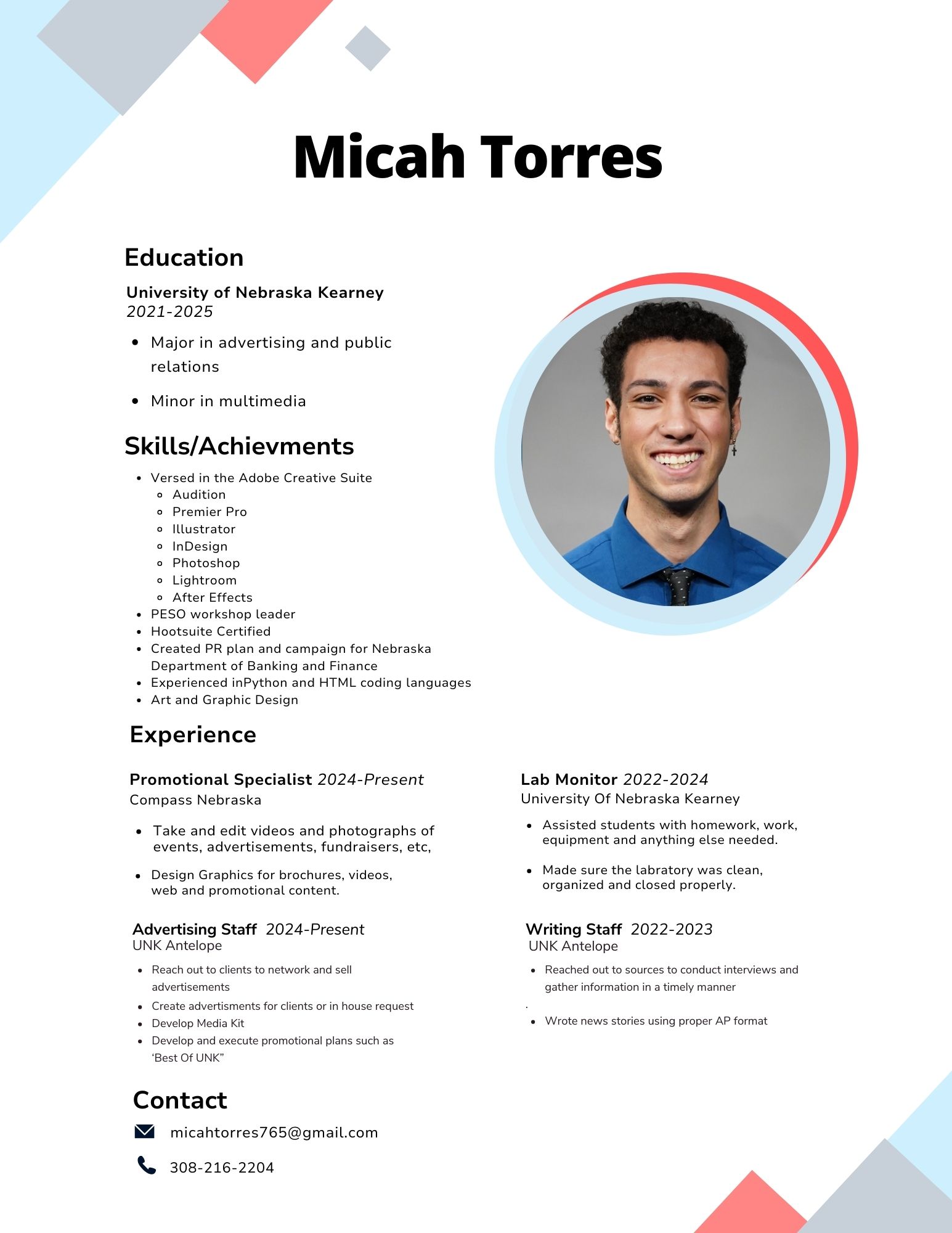 Bachelor of Arts in Advertising and Public Relations, University of Nebraska Kearney, Expected Graduation: December 2025